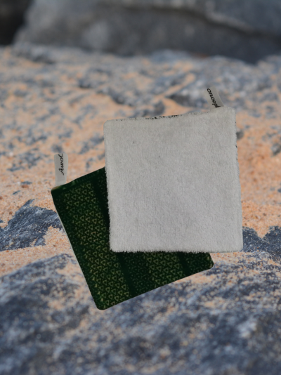 Fait main, elle est en wax 100% coton avec une éponge de bambou Oeko-Tex, 90% viscose de nouba et 10% polyester.
